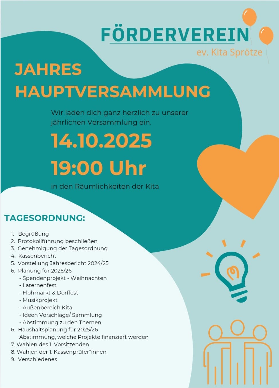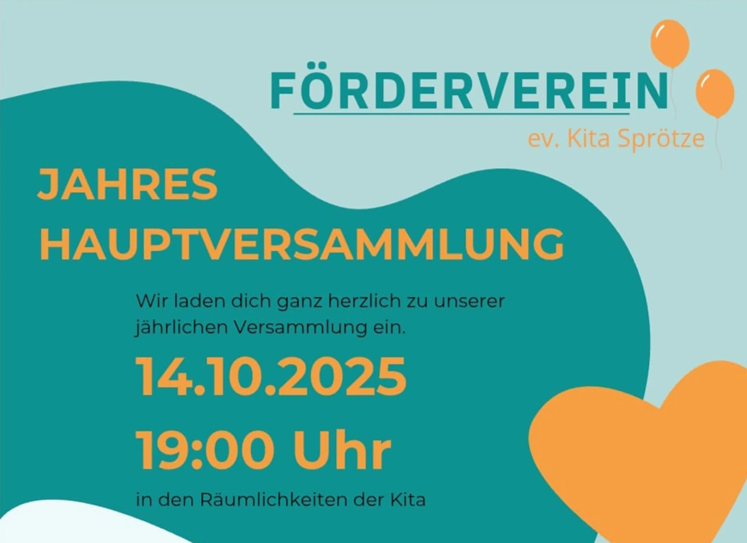 Am Dienstag, den 14.10.2025 findet um 19 Uhr unsere Jahreshauptversammlung in der KiTa statt. Wir freuen uns über eine aktive Teilnahme. Sei dabei und entscheide mit!